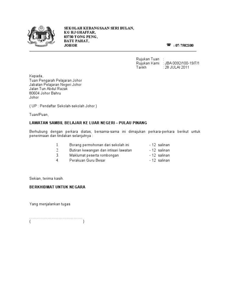 Contoh Surat Permohonan Kebenaran Lawatan Sambil Belajar