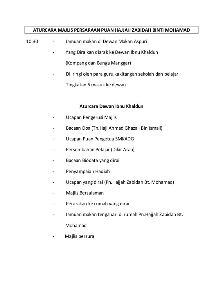 Aturcara Majlis Persaraan Puan Hajjah Zabidah Binti Mohamad